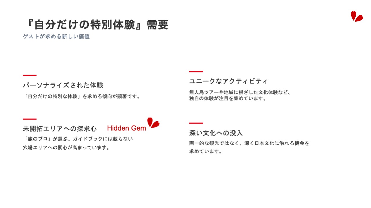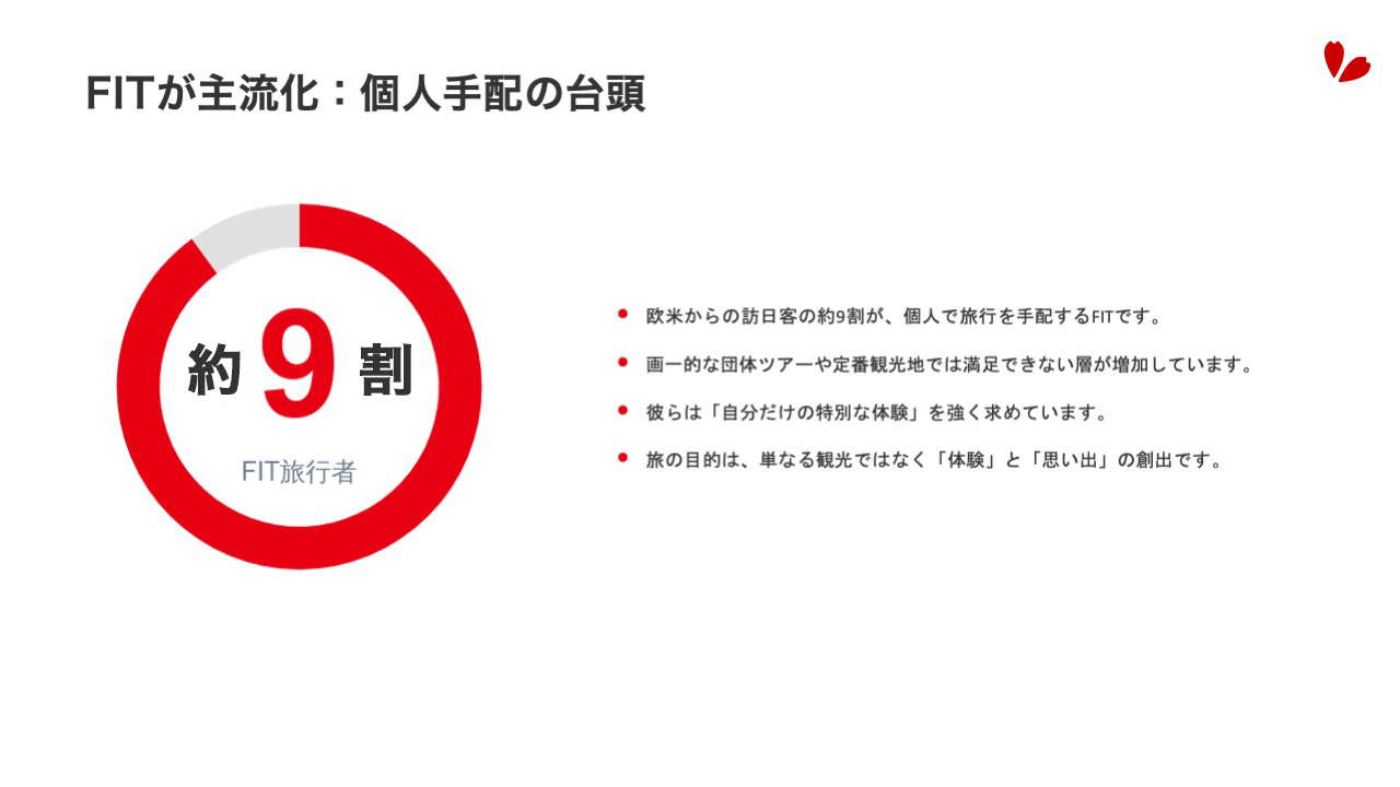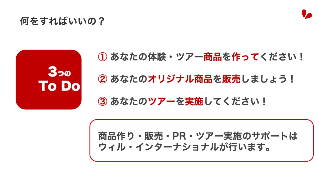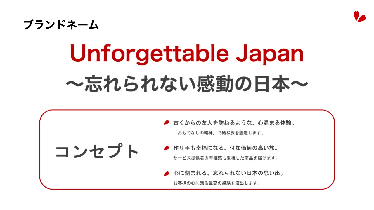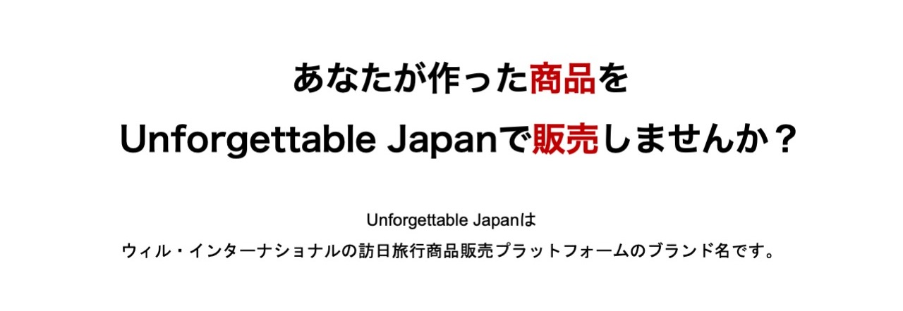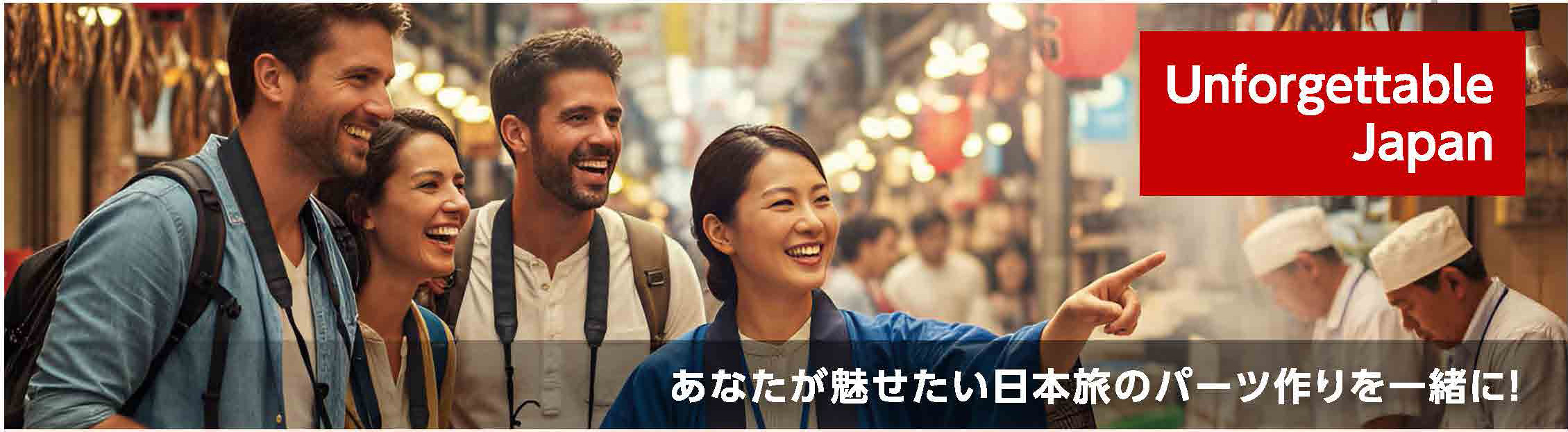 Unforgettable Japan(アンフォゲッタブル・ジャパン)は、 株式会社ウィル・インターナショナルが運営する訪日旅行商品と、販売プラットフォームのブランド名です。 プロフェッショナル主導の新しい旅づくりプロジェクト ウィル・インターナショナルに所属する旅のプロフェッショナルである皆さんが、ご自身で独自のユニークなアイディアを訪日旅行商品として企画したオリジナルの旅を一緒に販売・ツアー実施することができる仕組みです。 旅のプロフェッショナルであるツアーガイド、ツアーコーディネーターの皆さんの「おもてなしの心」と「プロの力」を収益に変えるための新しいプロジェクトです 。 プロジェクトの核:自立と協働による収益最大化 Unforgettable Japanは、プロフェッショナルの方々の収益を増やしていく新しい取り組みであり、以下の特徴を持ちます。 プロフェッショナルの自立: 旅のプロが主体となり、ご自身の「好き」や知識を活かしたオリジナルツアーを企画・販売・実施します 。 ウィル・インターナショナルの支援: お客様の心に響く特別なツアーを創り出すための活動を、株式会社ウィル・インターナショナルが支援、サポートし、助け合うことで、プロフェッショナルの方々の収益を増やしていきます。 高水準の収益還元: ツアーが販売された場合、売上の粗利の最大70%が収益となります 。 つまり、皆様の情熱とアイデアを、ウィル・インターナショナルの販売プラットフォームと運営サポート(決済、予約管理、OTA展開など )によって最大化し、共に成長を目指す「Guide自走式『旅なか』プロジェクト」です 。 こんな方のご参加をお待ちしています! 自分で納得のいくツアーを作って、収益を増やしたい方 面白いツアーのアイディアがある方 既存の仕事のみならず、新たなやりがいを探している方 自身の好きな人が来たら案内するいつものポイントをお持ちの方 なんかやってみたいけど、何をどうしたら良いのか、、、1人ではちょっと自信がない方 UJ Professional 登録〜業務終了までの流れに興味をお持ちいただけたらUJ Professional 登録〜業務終了までの流れページをご確認ください。 「何が何だかよくわからないけど、やってみよう」と思われた方や「まずは、具体的にどのようにして運営していくのか詳しく見てみたい」と思われた方は、ぜひ、ユーザー登録をお済ませいただきユーザーのみご覧いただけるコンテンツエリアにお進みください。 *ウィル・インターナショナルに鼠族されていない方は、株式会社ウィル・インターナショナルへのご登録からお願いします。